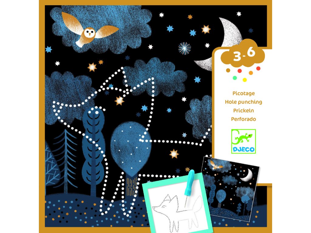 Obsah: 1 držák vyrobený z pěny a silného kartonu pro udržení listů na místě, 16 ilustrovaných pozadí, 16 šablon, 1 děrovací jehla, 1 sešit s návodem krok za krokem.